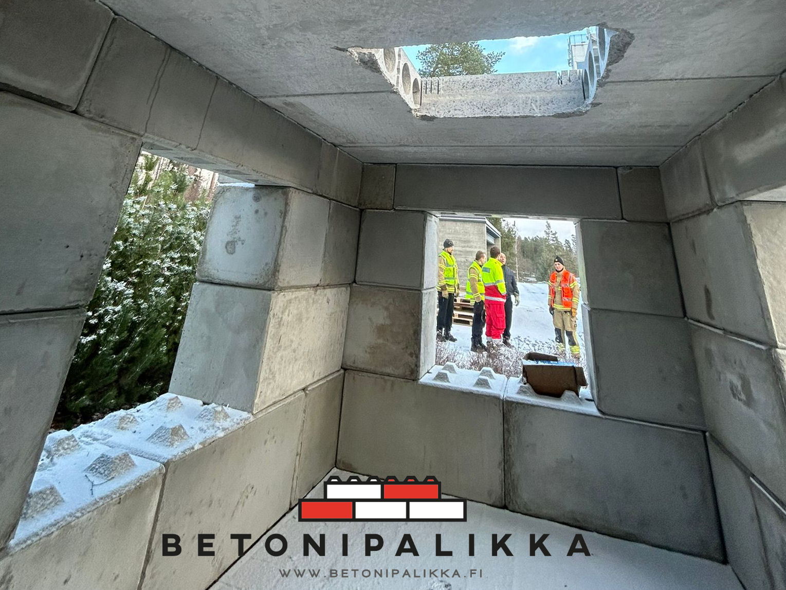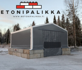 Kuvissa pelastustoimelle rakennettu bunkkeri ja Rautjärven kunnalle rakennettu 8×8 m pressuhalli.
