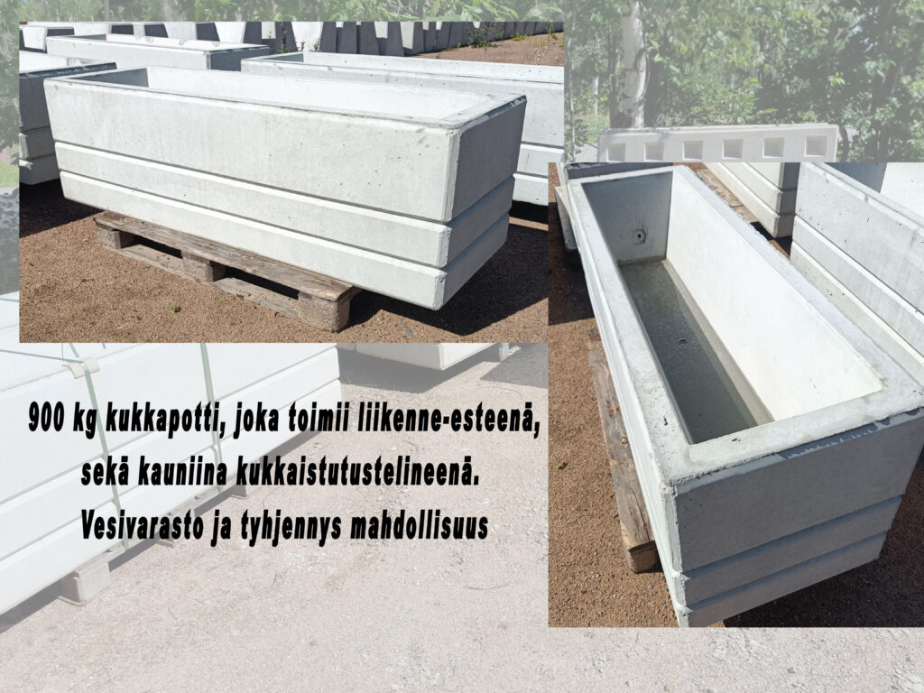 Betoniseen piharuukkuun voidaan laittaa mullat ja tuote kestää myös maanpainetta. Kukkalaatikko käy meidän betonipalikoiden päälle ollen tarvittaessa pihamuurin ylin kerros. Kysy myynnistä lisää.